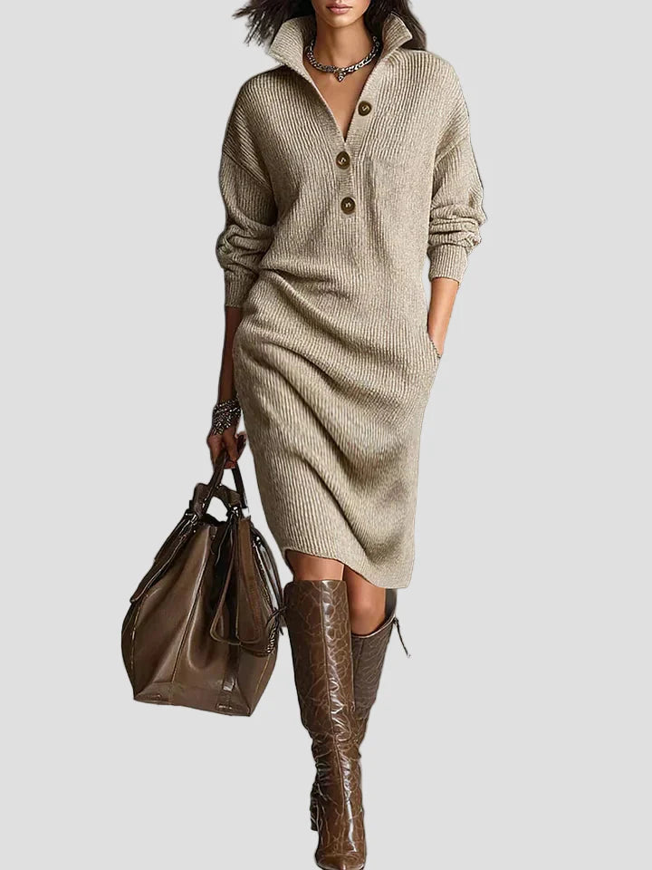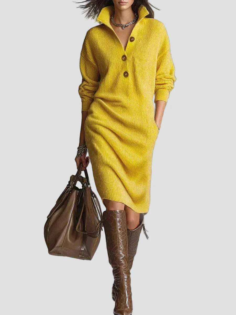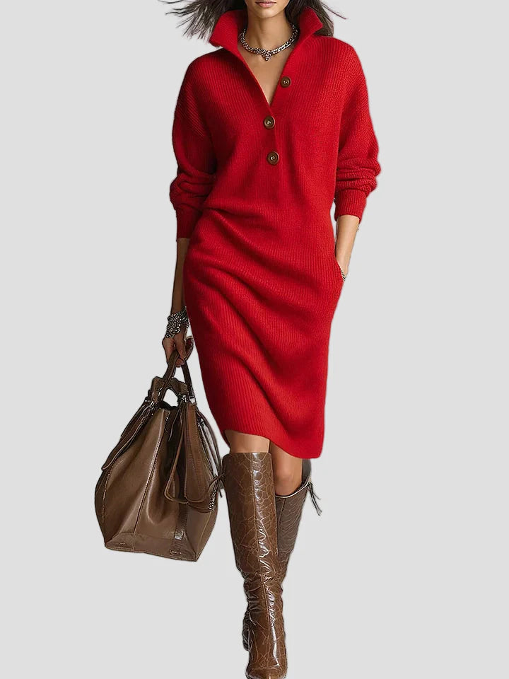Išbandykite eleganciją ir komfortą su Geneviève™ megztiniu midi suknele. Pagaminta iš minkšto, šilto ir kvėpuojančio audinio, ši suknelė idealiai tinka kasdieniam nešiojimui. Jos apykaklė su sagomis struktūrizuoja krūtinę ir išryškina veidą, o laisvas kirpimas užtikrina komfortą visą dieną.