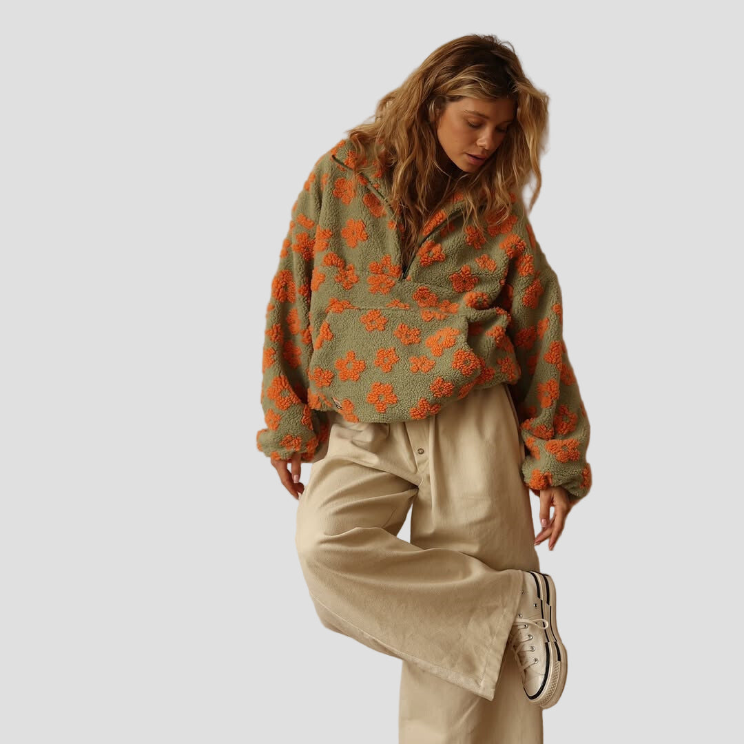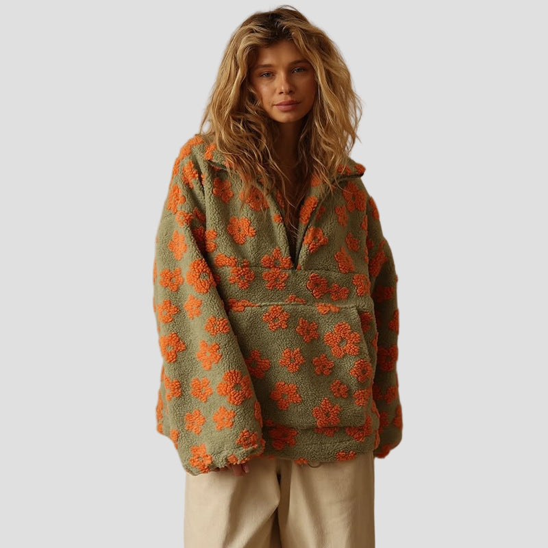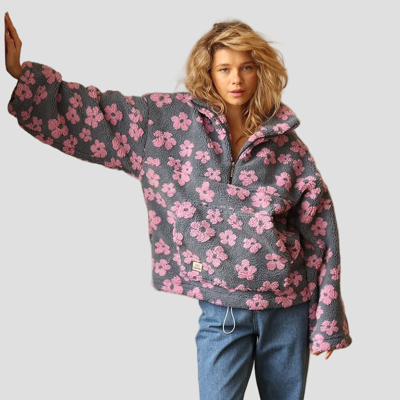 Pasinerkite į gryną komfortą su mūsų flisine striuke, pagaminta iš minkštos šerpos, kuri suteikia šiltą apkabinimą. Ideali vėsiems rudens dienoms ir jaukiems vakarams namuose. Su boho stiliaus gėlėmis, ši striukė ne tik šildo, bet ir suteikia žaismingą bei stilingą akcentą. Per didelis siluetas užtikrina atsipalaidavusią ir patogią išvaizdą, puikiai tinkančią tiek miesto kavinėje, tiek ramioje vakarienėje ant sofos.
