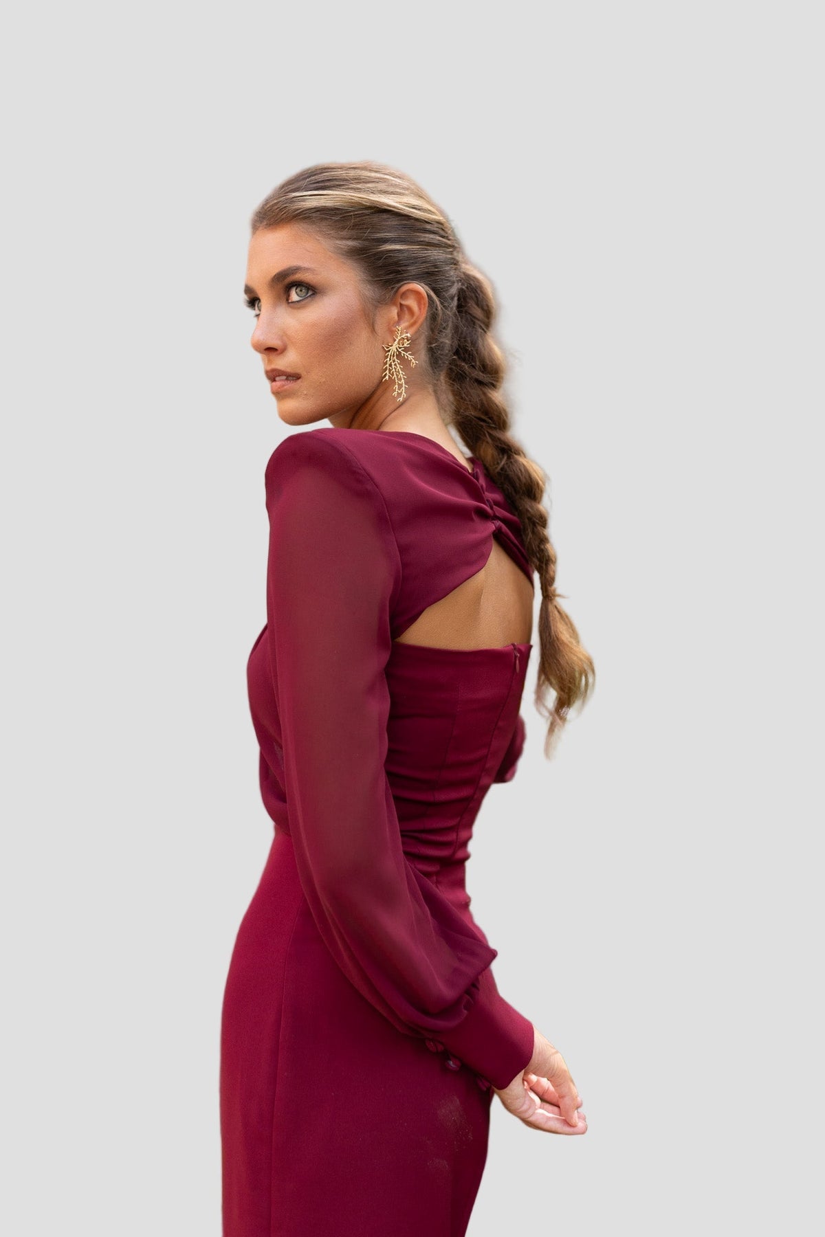 Išskirtinis ir modernus dizainas: Elegantiškas kryžminis iškirpimas su subtiliais išpjovimais ir permatomomis rankovėmis suteikia seksualumo ir rafinuotumo, puikiai tinka vestuvėms, oficialiems renginiams ar vakarėliams saulėlydyje.