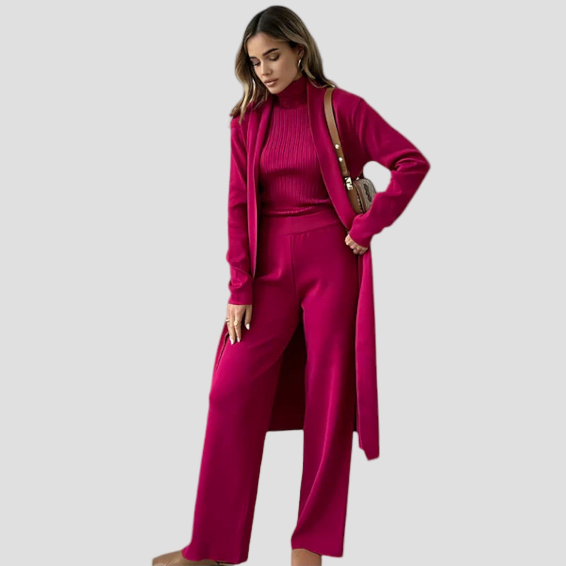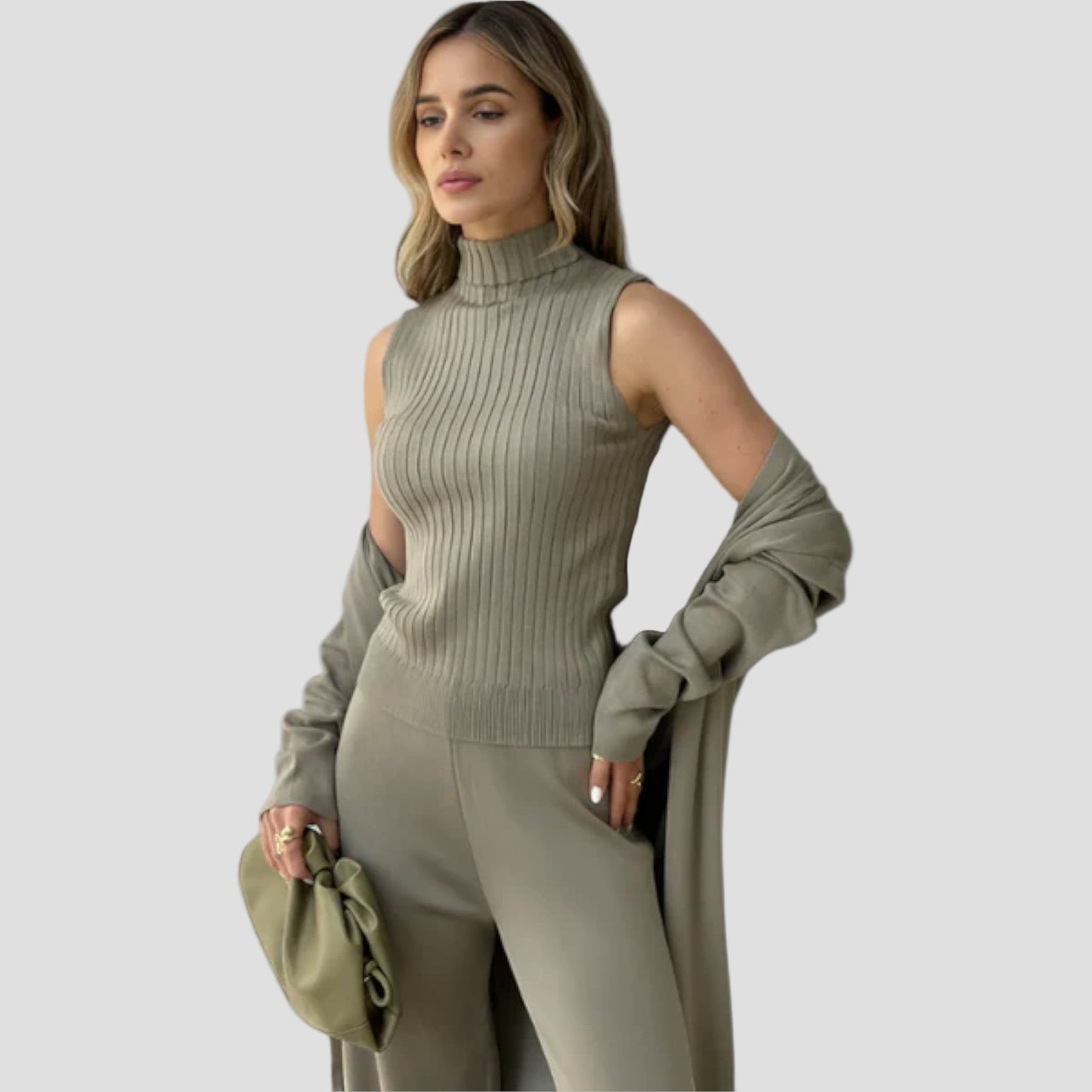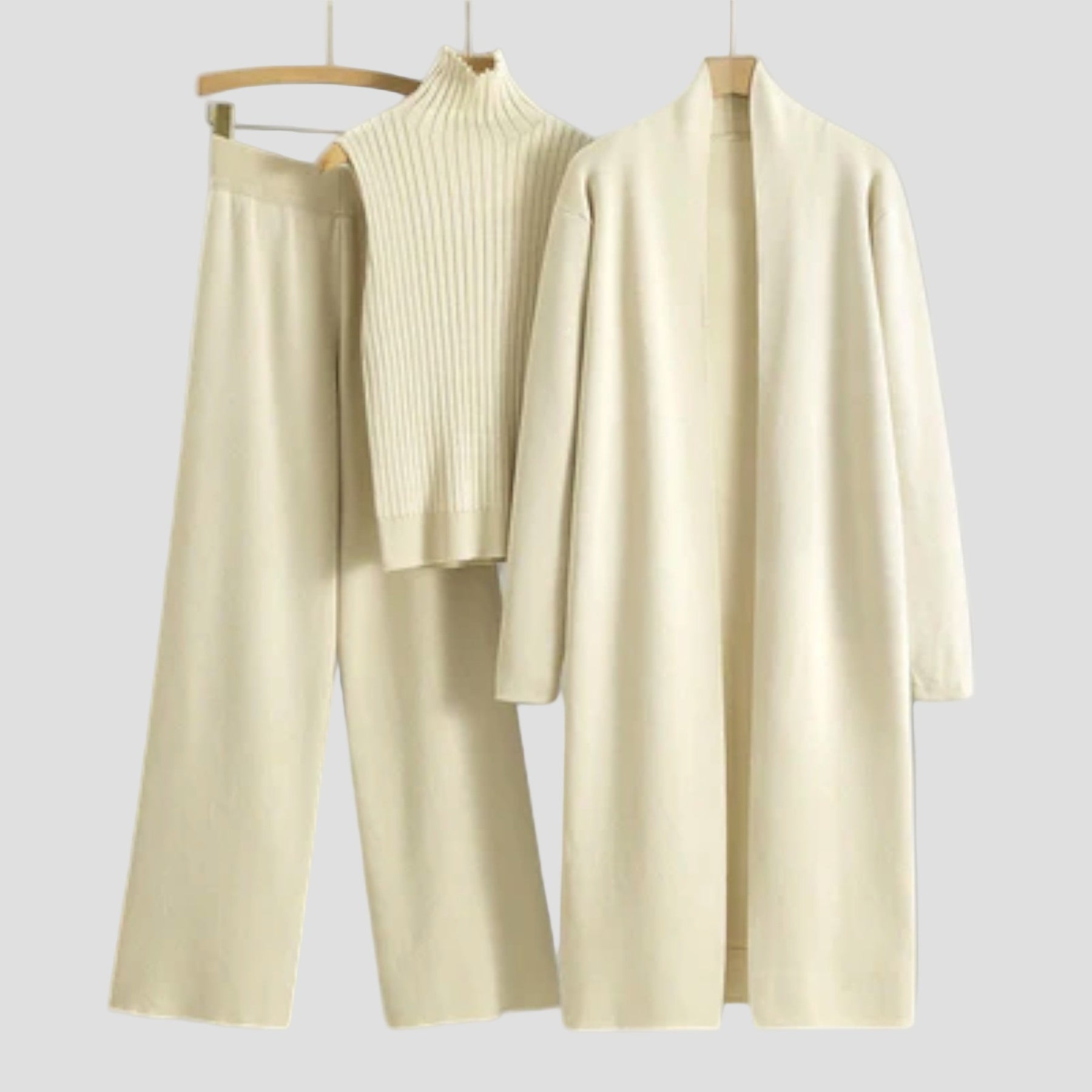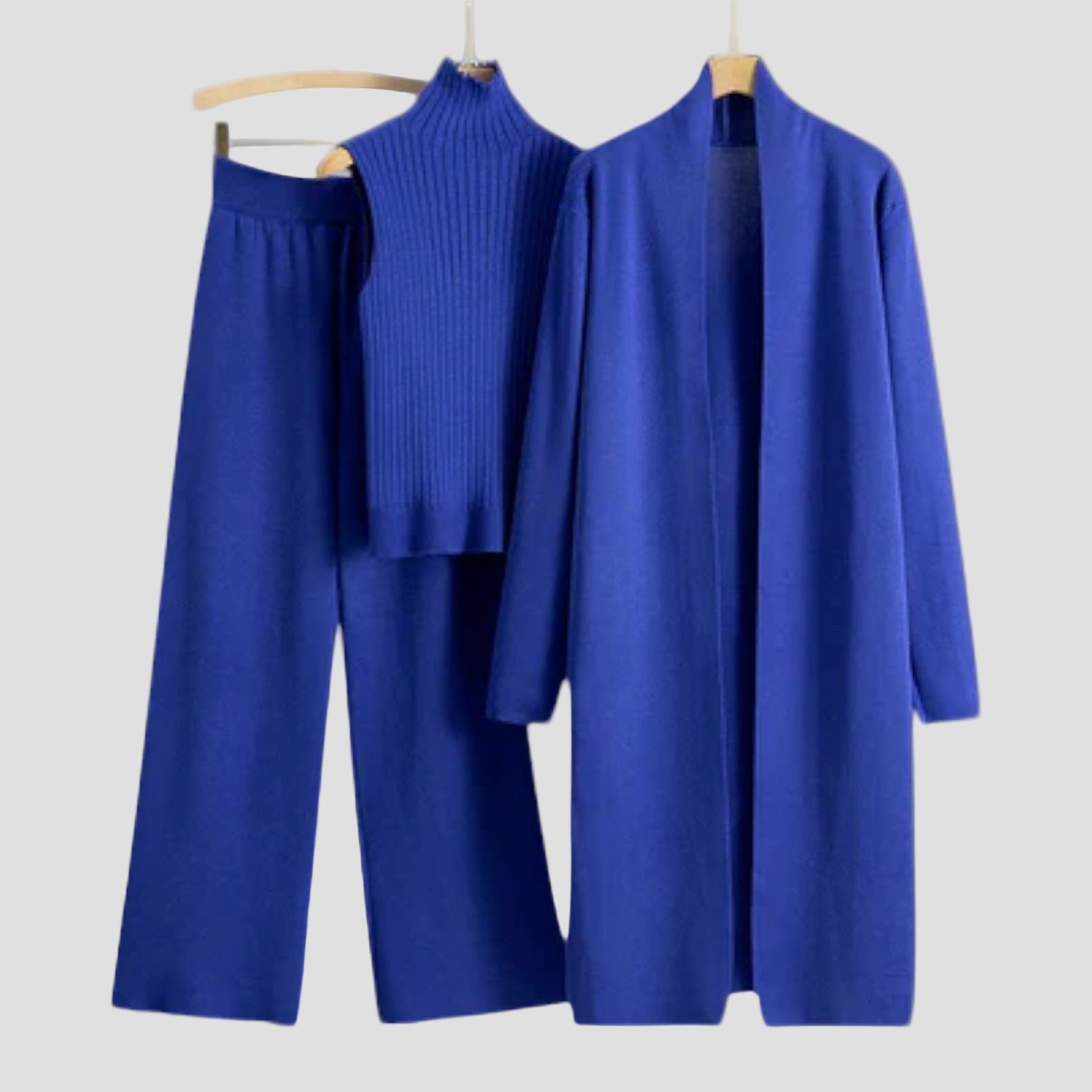 Sudarytu iš elegantiškų kelnių, kardigano ir rafinuoto topai. Šis ansamblis sujungia komfortą ir eleganciją tobulai harmonijoje, idealiai tinka įvairiems įvaizdžiams.