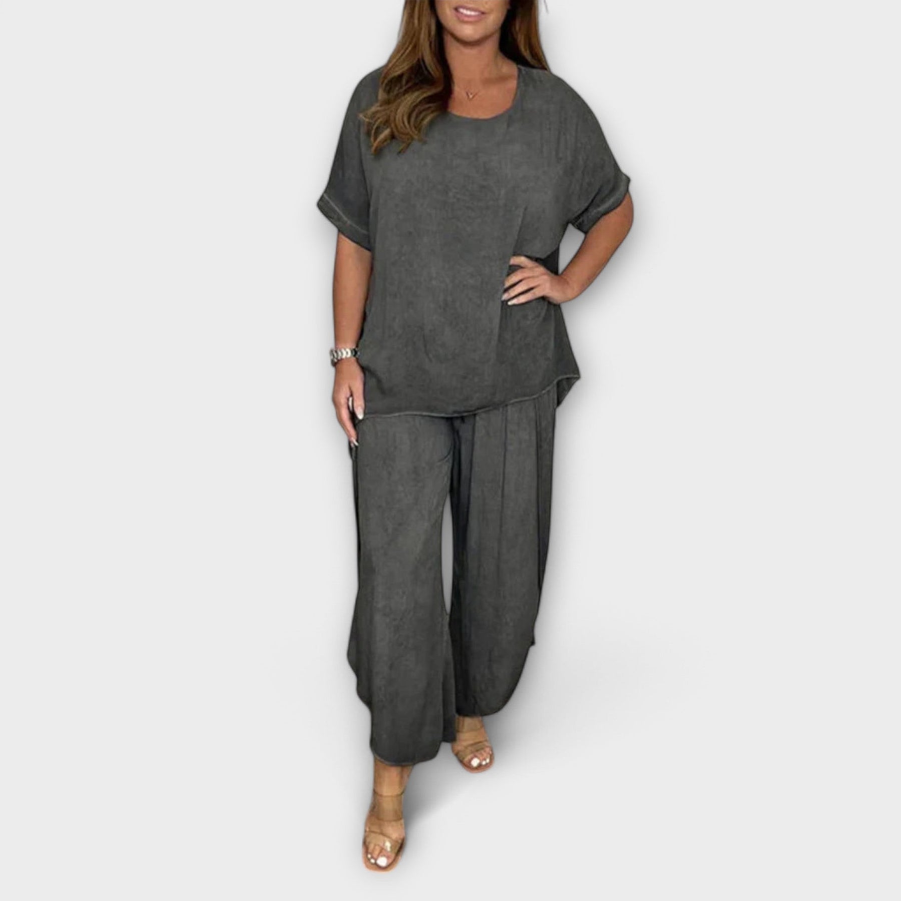 Atraskite mūsų patogų ir laisvą dviejų dalių komplektą, kuris sujungia paprastą eleganciją su maksimaliu komfortu. Puikiai tinka kasdienai, šis ansamblis sujungia laisvą viršutinę dalį su atsitiktinėmis ilgomis kelnėmis – idealus pavasariui, vasarai ir rudeniui.