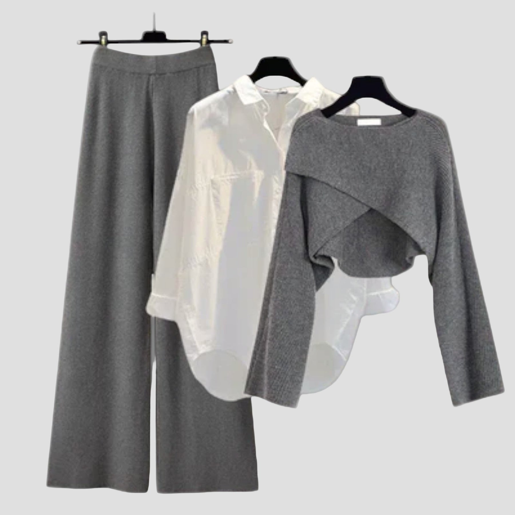 Šis trijų dalių moterų komplektas puikiai tinka visoms, kurios ieško stiliaus, komforto ir lankstumo. Komplektą sudaro stilingas megztinis, klasikinė balta palaidinė ir plačios kelnės, kurios yra idealiai tinkančios tiek biurui, tiek laisvalaikio išvykoms. Ekologiškos medvilnės ir kvėpuojančio poliesterio derinys užtikrina maksimalų komfortą, o tamprus audinys suteikia judėjimo laisvę. Atsipalaidavusi kelnių forma ir stilingas megztinio dizainas sukuria modernų ir rafinuotą įvaizdį, dėl kurio šis komplektas tampa puikia pasirinkimo galimybe komfortiškam ir elegantiškam aprangai.