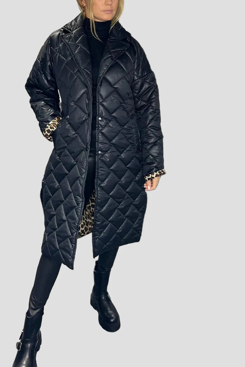 Išbandykite amžiną eleganciją su dvipusiu siuvinėtasis paltu Daiva. Šis paltas su minimalistiniu išoriniu dizainu slepia elegantišką leopardo rašto pamušalą, kuris atsiskleidžia ant rankovių arba viduje, suteikdamas unikalų stilių, kuris visada pritraukia žvilgsnius.